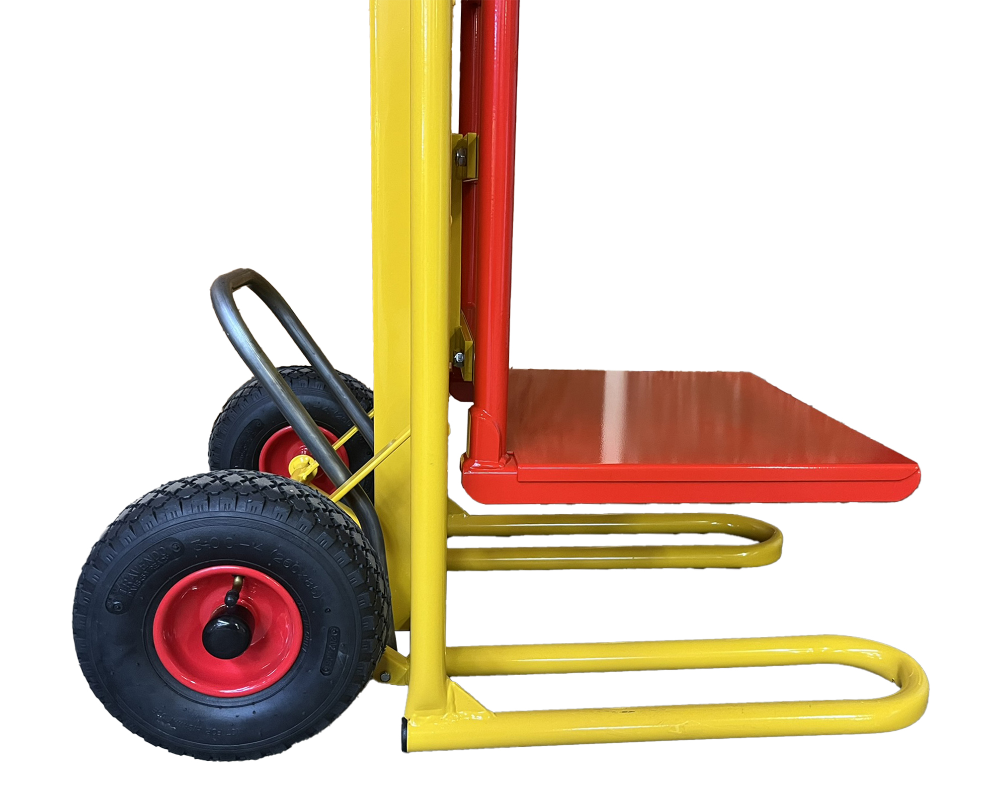 Wózek wyposażono w duże, pneumatyczne koła (3.00 x 4) z łożyskami rolkowymi, które gwarantują płynną jazdę nawet na nierównych powierzchniach, takich jak beton, kostka czy teren zewnętrzny.